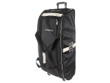 This heavy-duty cricket bag features wheels, a pull handle, protective runners, and an abrasion-resistant bottom panel for durability and easy transport.